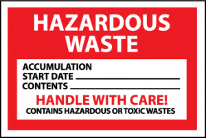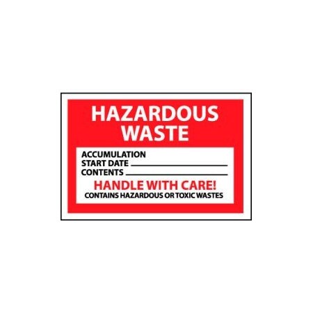NMC HW19 HAZARDOUS WASTE ACCUMULATION START DATE___ CONTENTS___ HANDLE WITH CARE! CONTAINS HAZARDOUS OR TOXIC WASTES Label – PS Vinyl Hazardous Waste Label,White
