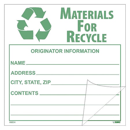 NMC National Marker Corp. HW34SL5 Self-Laminating Labels, Materials for Recycle, 6 Inch X 6 Inch, PS Vinyl, 5/Pk