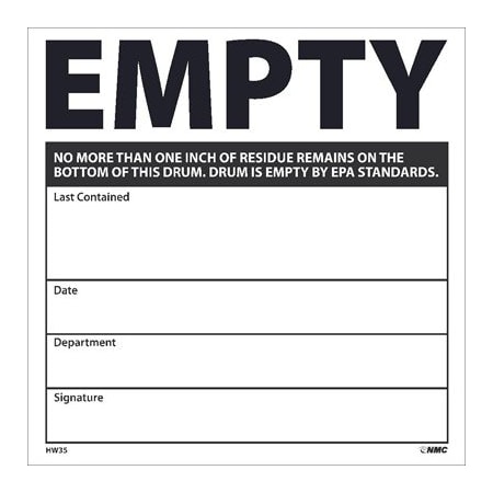 NMC - National Marker Company LABELS, EMPTY..NO MORE THAN ONE INCH OF RESIDUE REMAINS ON THE BOTTOM OF THIS DRUM..DRUM IS EMPTY BY EPA STANDARDS .., 6X6, PS VINYL Hazardous Waste Container Labels Identify the contents of Hazardous Waste containers with the proper labels.