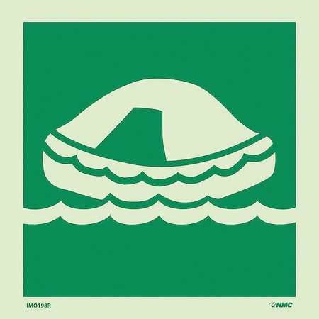 NMC IMO198r International Marine Organization Life Raft Sign - 6 in. Square Safety Sign with Life Raft Graphic, 6 Hour Glow Rigid, Green on Glow Yellow