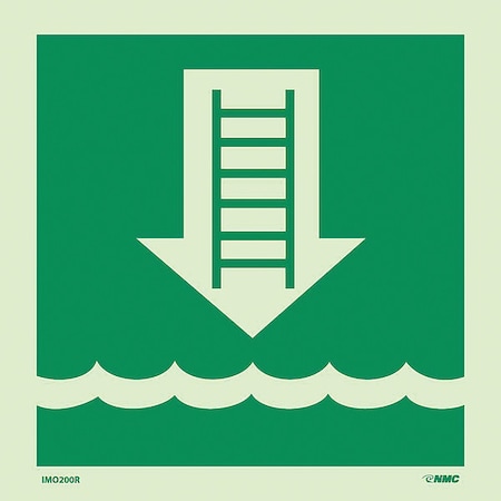 NMC IMO200R International Marine Organization Embarkation Ladder Sign - 6 in. Square Safety Sign with Graphic, 6 Hour Glow Rigid, Green on Glow Yellow