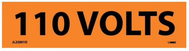 NMC JL22001O Voltage Marker, Legend "110 Volts", 4-1/2 Length x 1-1/8" Height, Pressure Sensitive Vinyl, Black on Orange