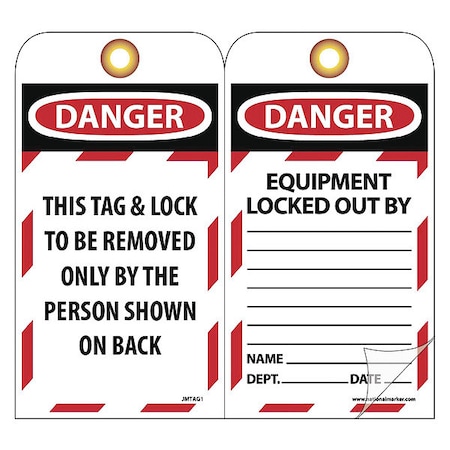 - Tag Legend: the both the front DANGER – THIS TAG & LOCK TO BE REMOVED ONLY BY THE PERSON SHOWN ON FRONT and back legend DANGER – EQUIPMENT LOCKED OUT BY are printed in contrasting colors for clear visibility