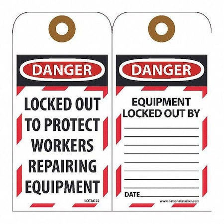 NMC LOTAG22 "Danger - Locked Out to Protect Workers Repairing Equipment" Lockout Tag, Unrippable Vinyl, 3" Length, 6" Height, Black/Red on White (Pack of 10)