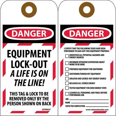 NMC Danger A Life Is On The Line Lockout Tags convey lockout directions and safety information. Prevents accidental or unexpected startup or release of stored energy when working on equipment and machinery.15 mil thick vinyl will not rip. (A) has a lined area to write information. (B) includes a checklist. Sold in packs of 10.