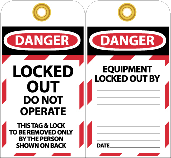 - Tag Legend: the front legend reads LOCKED OUT - DO NOT OPERATE. The back has the legend EQUIPMENT LOCKED OUT BY _____ DATE ______ printed on it