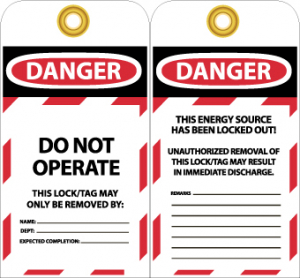 - Front of tag reads, "Do Not Operate - This lock/tag may only be removed by:" followed by two blank lined areas labeled "Name," "Dept," and "Expected Completion"