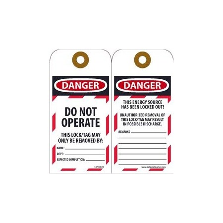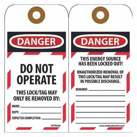 NMC - National Marker Company Tag, Danger, Do Not Operate, 6X3, Unrip Vinyl Lockout Tags Prevent accidental or unexpected startup or release of stored energy when working on equipment and machinery.