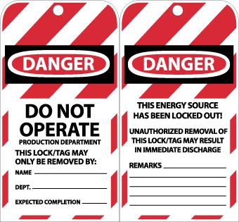 - Header "DANGER" and legend "DO NOT OPERATE PRODUCTION DEPARTMENT THIS LOCK/TAG MAY ONLY BE REMOVED BY:"