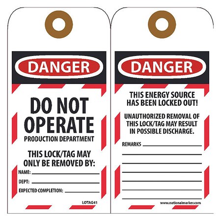 NMC LOTAG41 "Danger - DO NOT Operate Production Department" Lockout Tag, Unrippable Vinyl, 3" Length, 6" Height, Black/Red on White (Pack of 10)