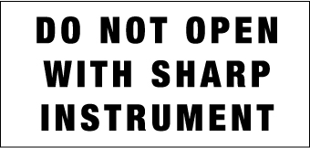 Do Not Open with Sharp Instrument, 4-1/4 Inch Wide x 2 Inch High, Paper Label Rectangular, Black on White, Indoor or Outdoor, Shipping Label 1/RL