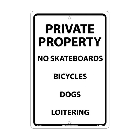 NMC M113G Security Sign, Legend "PRIVATE PROPERTY NO SKATEBOARDS BICYCLES DOGS LOITERING", 12" Length x 18" Height, Aluminum 0.040, Black on White