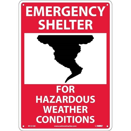 NMC M121PB Emergency and First Aid Sign with Graphic, Legend "EMERGENCY SHELTER FOR HAZARDOUS WEATHER CONDITIONS", 10" Length x 14" Height, Pressure Sensitive Vinyl, Black/Red on White