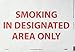 - Easily Visible: the legend “SMOKING IN DESIGNATED AREAS ONLY” is printed in bold and legible text to ensure clear visibility even from a distance