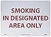 - Easily Visible: the legend “SMOKING IN DESIGNATED AREAS ONLY” is printed in bold and legible text to ensure clear visibility even from a distance