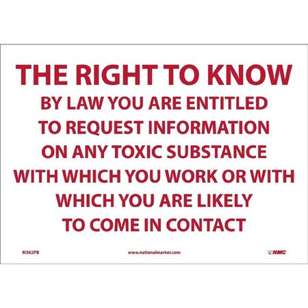 NMC M362RB Restricted Area Sign, Legend "THE RIGHT TO KNOW BY LAW YOU ARE ENTITLED TO REQUEST INFORMATION ON ANY TOXIC SUBSTANCE WITH WHICH YOU WORK OR WITH WHICH YOU ARE LIKELY TO COME IN CONTACT WITH", 14" Length x 10" Height, Rigid Plastic, Red on white