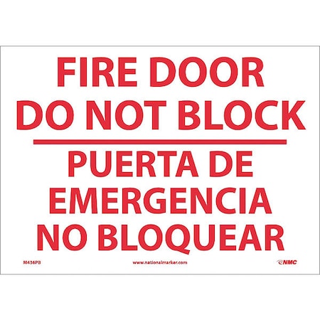 NMC M436PB Bilingual Restricted Area Sign, Legend "FIRE DOOR DO NOT BLOCK", 14" Length x 10" Height, Pressure Sensitive Vinyl, Red on White, 10 x 14