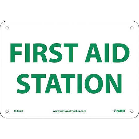 NMC M442R Emergency and First Aid Sign, Legend "FIRST AID STATION", 10" Length x 7" Height, Rigid Polystyrene Plastic, Green on White
