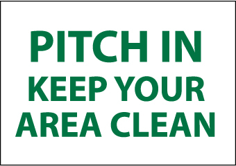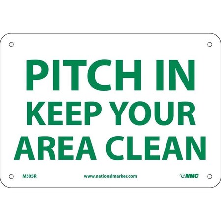 NMC M505P Housekeeping Sign, Legend "PITCH IN KEEP YOUR AREA CLEAN", 10" Length x 7" Height, Pressure Sensitive Vinyl, Green on White