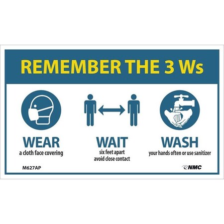 NMC M627AP Remember The 3 Ws Wear Wait Wash, Label, 3X5, Adhesive Backed Vinyl, Pack of 5