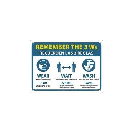 NMC M627RB Remember The 3 W's Sign (Wear, Wait, Wash), 10 X 14, English/Spanish, Rigid Plastic, Multicolor