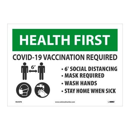 NMC M640PB Health First COVID-19 Vaccination Required, 10 X 14 Sign, Pressure Sensitive Vinyl .0045, Green