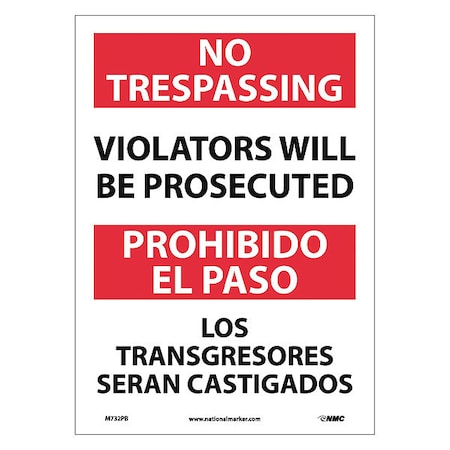 NMC M732PB Bilingual Security Sign, Legend "NO TRESPASSING VIOLATORS WILL BE PROSECUTED", 10" Length x 14" Height, Pressure Sensitive Vinyl, Red/Black on White