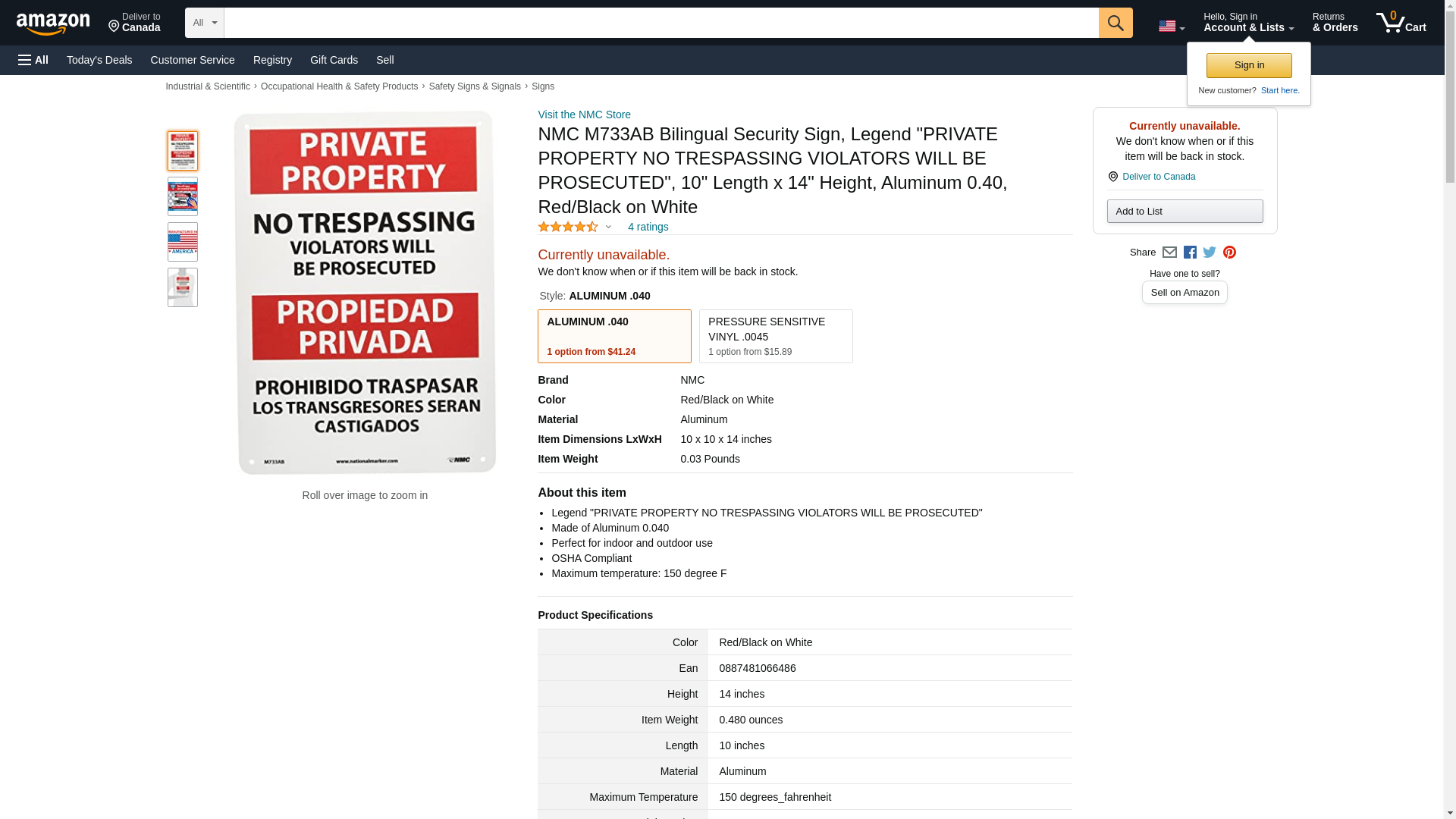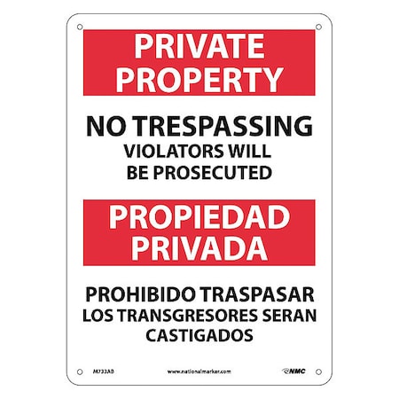 NMC M733AB Bilingual Security Sign, Legend "PRIVATE PROPERTY NO TRESPASSING VIOLATORS WILL BE PROSECUTED", 10" Length x 14" Height, Aluminum 0.40, Red/Black on White