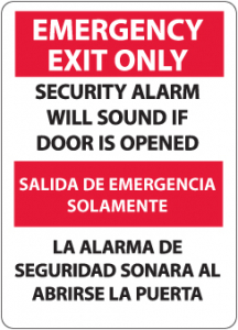- Legend "EMERGENCY EXIT ONLY SECURITY ALARM WILL SOUND IF DOOR IS OPENED"