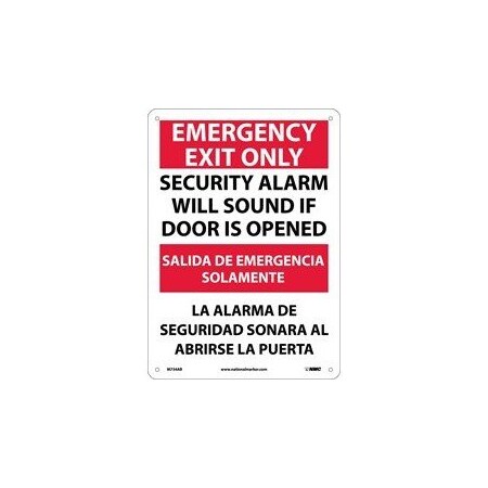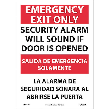 NMC M734PB Bilingual Exit/Entrance Sign, Legend "EMERGENCY EXIT ONLY SECURITY ALARM WILL SOUND IF DOOR IS OPENED", 10" Length x 14" Height, Pressure Sensitive Vinyl, Red/Black on White