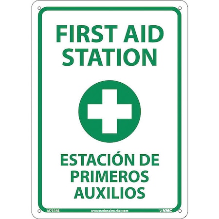 NMC M737AB Bilingual Emergency and First Aid Sign, Legend "FIRST AID STATION" with Graphic, 10" Length x 14" Height, Aluminum 0.40, Green on White
