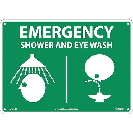 NMC M752RB Emergency and First Aid Sign, Legend "EMERGENCY SHOWER & EYE" with Graphic, 14" Length x 10" Height, Rigid Polystyrene Plastic, White on Green