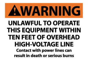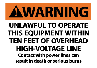 - Legend "WARNING UNLAWFUL TO OPERATE THIS EQUIPMENT WITHIN TEN FEET OF OVERHEAD HIGH-VOLTAGE LINES CONTACT WITH POWER LINES CAN RESULT IN DEATH OR SERIOUS BURNS"