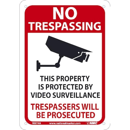 NMC M974A NO TRESPASSING Video Surveillance Sign - 7 in. x 10 in., Standard Aluminum Admittance Security Sign with Black/Red Text on White Base