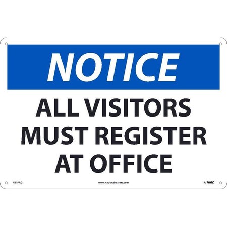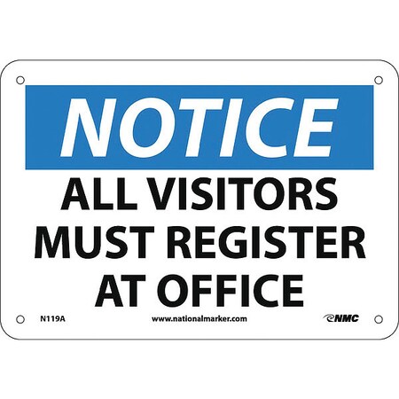 NMC N119A OSHA Sign, Legend "NOTICE - ALL VISITORS MUST REGISTER AT OFFICE", 10" Length x 7" Height, Aluminum, Black/Blue on White
