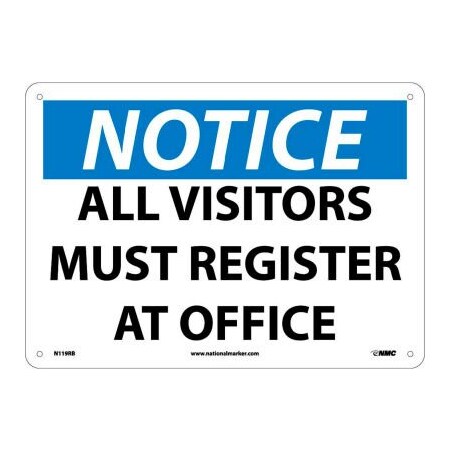 NMC N119RB OSHA Sign, "NOTICE ALL VISITORS MUST REGISTER AT OFFICE", 14" Width x 10" Height, Rigid Plastic, Black/Blue On White