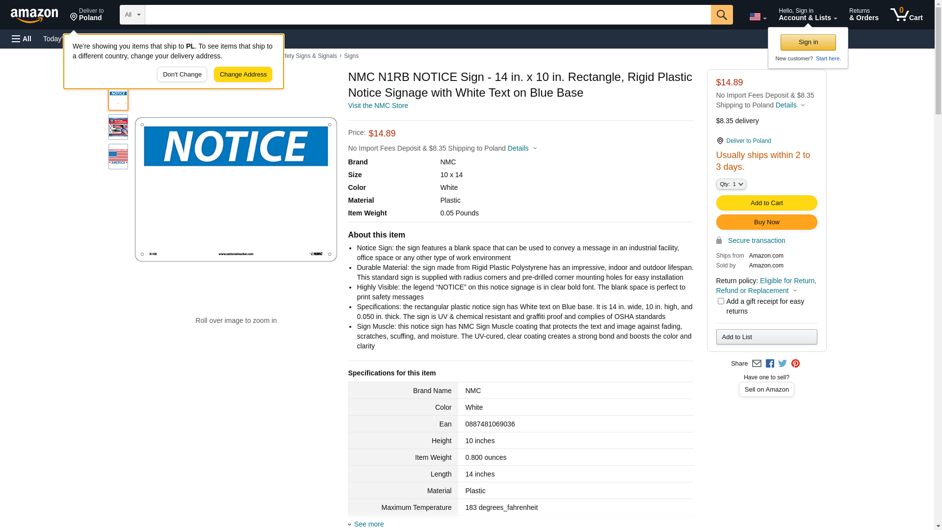 - Specifications: the rectangular plastic notice sign has White text on Blue base. It is 14 in. wide, 10 in. high, and 0.050 in. thick. The sign is UV & chemical resistant and graffiti proof and complies of OSHA standards