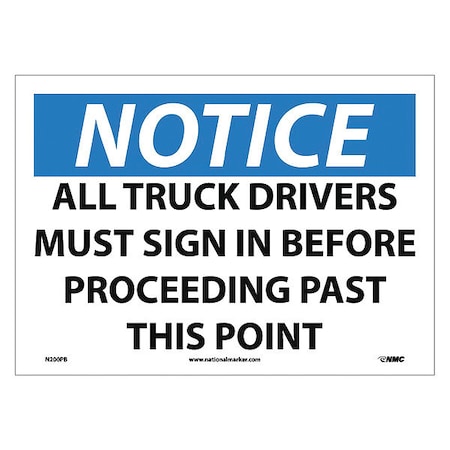 NMC N200PB OSHA Sign, Legend "NOTICE - ALL TRUCK DRIVERS MUST SIGN IN BEFORE PROCEEDING PAST THIS POINT", 14" Length x 10" Height, Pressure Sensitive Vinyl, Black/Blue on White