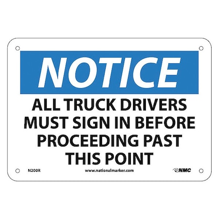 NMC N200R OSHA Sign, Legend "NOTICE - ALL TRUCK DRIVERS MUST SIGN IN BEFORE PROCEEDING PAST THIS POINT", 10" Length x 7" Height, Rigid Plastic, Black/Blue on White