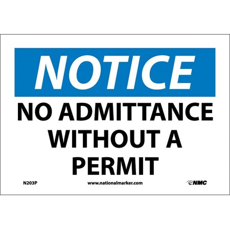 NMC N203P OSHA Sign, Legend "NOTICE - NO ADMITTANCE WITHOUT A PERMIT", 10" Length x 7" Height, Pressure Sensitive Vinyl, Black/Blue on White