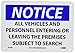 | Feature | Header "NOTICE" and Legend "ALL VEHICLES AND PERSONNEL ENTERING OR LEAVING THE PREMISES SUBJECT TO SEARCH" |