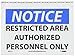 - Visibility: the legend “NOTICE - RESTRICTED AREA - AUTHORIZED PERSONNEL ONLY” in bold makes the sign clearly visible on the entryways and doors