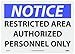 - Visibility: the legend “NOTICE - RESTRICTED AREA - AUTHORIZED PERSONNEL ONLY” in bold makes the sign clearly visible on the entryways and doors