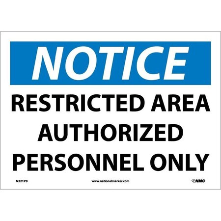 NMC N221RB NOTICE - RESTRICTED AREA - AUTHORIZED PERSONNEL ONLY – 14 in. x 10 in. Rigid Plastic Notice Sign with White/Black Text on Blue/White Base