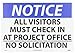 - Visible Text: the legend “NOTICE - ALL VISITORS MUST CHECK IN AT PROJECT OFFICE - NO SOLICITATION” on this security & admittance notice sign has bold and clear text printed on it. The legible format of the text makes the sign highly visible
