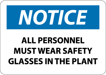 - Visibility: the workplace protection notice sign has legend “NOTICE - ALL PERSONNEL MUST WEAR SAFETY GLASSES IN THE PLANT” printed in bold letters. The font format makes the sign easy to read even in low light conditions
