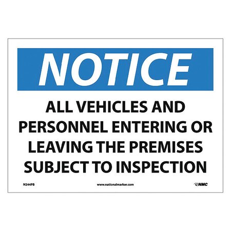 NMC N244PB OSHA Sign, Legend "NOTICE - ALL VEHICLES AND PERSONNEL ENTERING OR LEAVING THE PREMISES SUBJECT TO INSPECTION", 14" Length x 10" Height, Pressure Sensitive Vinyl, Black/Blue on White