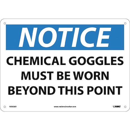 NMC N250AB OSHA Sign, Legend "NOTICE - CHEMICAL GOGGLES MUST BE WORN BEYOND THIS POINT", 14" Length x 10" Height, Aluminum, Black/Blue on White