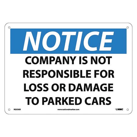 NMC N253AB OSHA Sign, Legend "NOTICE - COMPANY IS NOT RESPONSIBLE FOR LOSS OR DAMAGE TO PARKED CARS", 14" Length x 10" Height, Aluminum, Black/Blue on White