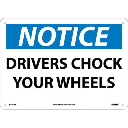 NMC N264AB OSHA Sign, Legend "NOTICE - DRIVERS CHOCK YOUR WHEELS", 14" Length x 10" Height, Aluminum, Black/Blue on White